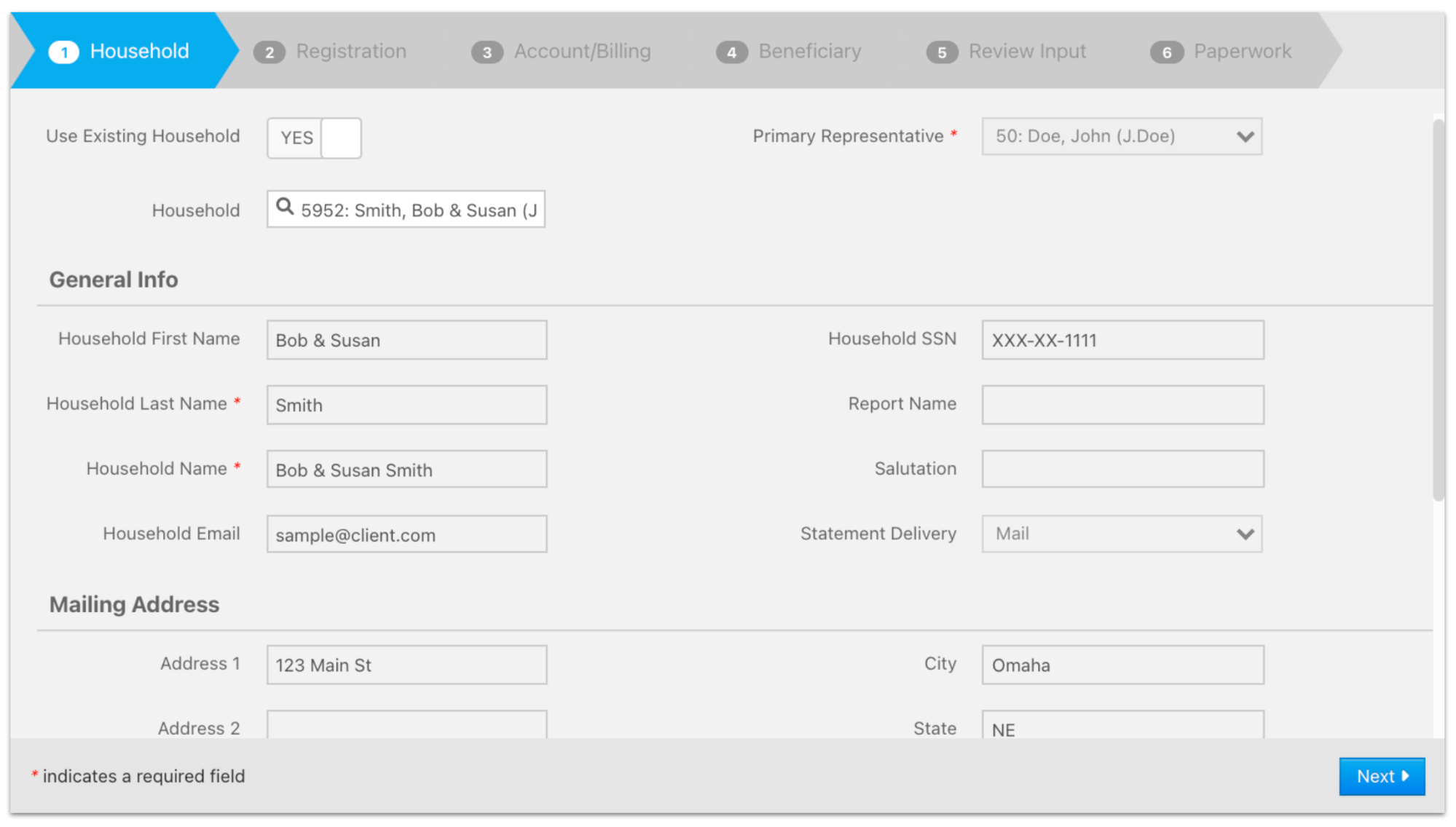 - Household step - Add the account to an existing household or create a new one. Then, click Next.
