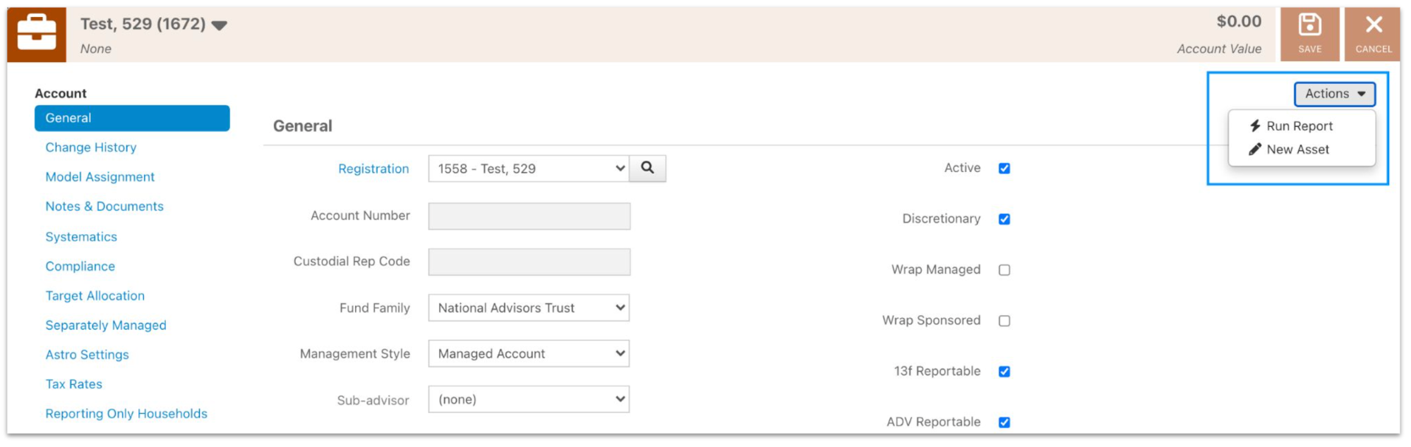 - On the Account - General tab in the edit account screen, click the Actions dropdown in the top right corner and click New Asset.