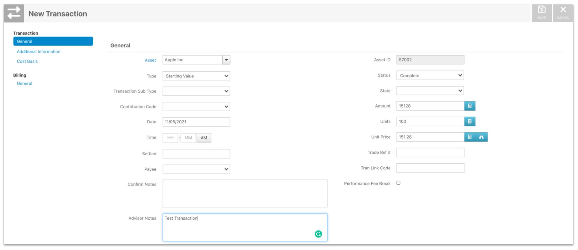 - Transaction Type: If you are adding a funding transaction within the account, the most common Types are Starting Value, Contribution, or Merge in from Other Account. If you are only tracking asset value and not full transaction history, use the "Increase/Decrease in Value" transaction type for future transactions depending on if your asset needs to go up or down in value.