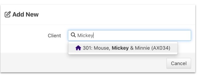- Enter the name or Household ID of the client you are creating login credentials for, and click on the household in the dropdown menu
