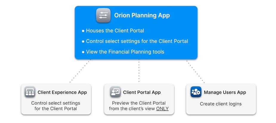 First, it’s essential to understand how all three components function both together and separately. The Orion Planning Application includes both the Client Portal and Financial Planning tools. However, these two features operate independently. By default, the Financial Planning tools are turned off and must be enabled separately. Feel free to watch the Orion Client Portal Overview and Demo video to learn more!