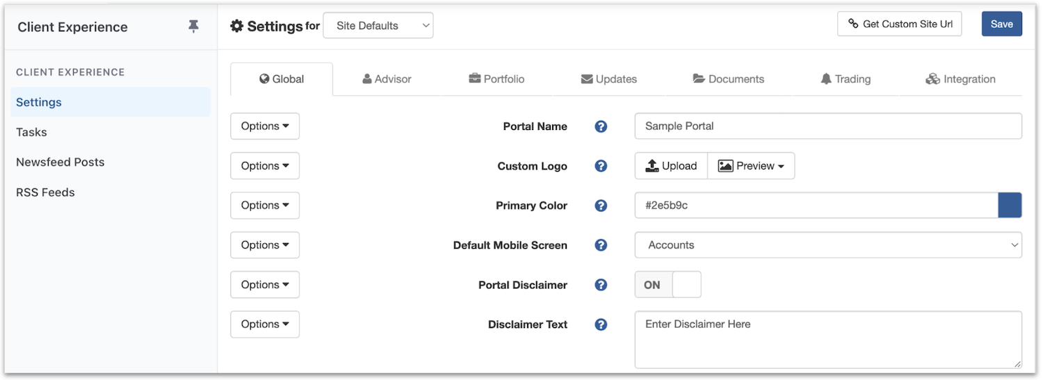 Custom URL: To send your clients a customized login link for Orion (it'll have your logo) copy the "Custom Site URL" link in the upper right hand corner in the Client Experience App. You can use this link to send to clients, rather than the normal Orion login site that you normally use as an advisor.
