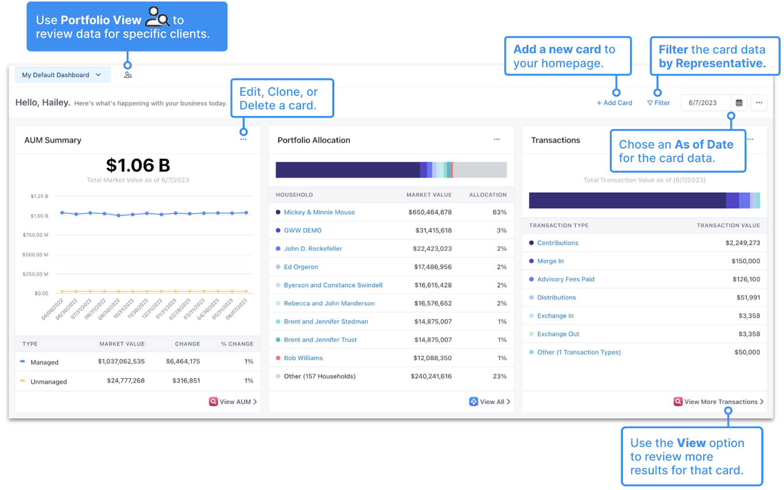 The Orion homepage shows a snapshot of your book of business as of the close of the previous business day. The default page will display information such as top and bottom performers and an account summary showing new accounts that have been added, excluded, or have a $0 balance. The default dashboard is not customizable, however, you can create your own dashboard to add additional tiles and fully customize the settings. Here is a link to an interactive guide that will walk you through each step creating your own dashboard.