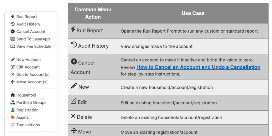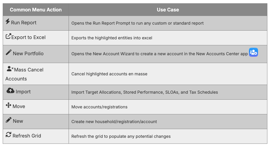 Right-click on any entity in the grid to open up the navigation menu. This tool provides quick access to specific actions for that particular entity and allows navigation to related entities. For example, to see all the assets within a household, select the household, right-click, and select Assets. Keep in mind, some menu options vary depending on what entity level you are viewing.